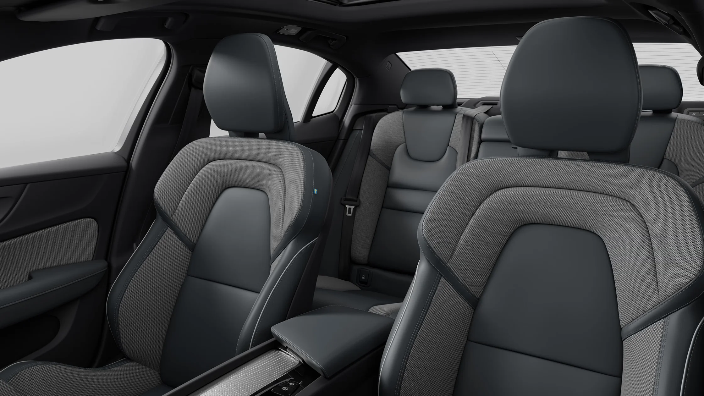 All trims use high-grade materials consistent with Volvo's interior design standards. Leatherette or leather upholstery is available in colors such as Charcoal, Blonde, and Maroon Brown depending on the trim. Premium seating materials, including ventilated Nappa leather and wool blends, are optional in select upper trims. Linear lime, metal mesh, and driftwood inlays complement the seating surfaces. Interior illumination is high-level on upper variants, and foldable rear seats are included for increased flexibility. Fixed rear seatbacks are limited to specific configurations. Headliners are available in Blonde or Charcoal depending on the interior color package.